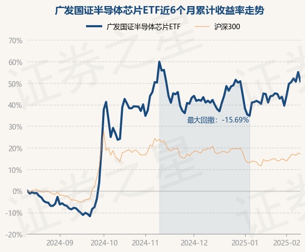 证券之星消息,2月13日,广发国证半导体芯片ETF最新单位净值为0.6352元,累计净值为1.2704元,较前一交易日下跌2.77%。历史数据显示该基金近1个月上涨7.44%,近3个月下跌3.39%,近6个月上涨50.81%,近1年上涨61.79%。该基金近6个月的累计收益率走势如下图: