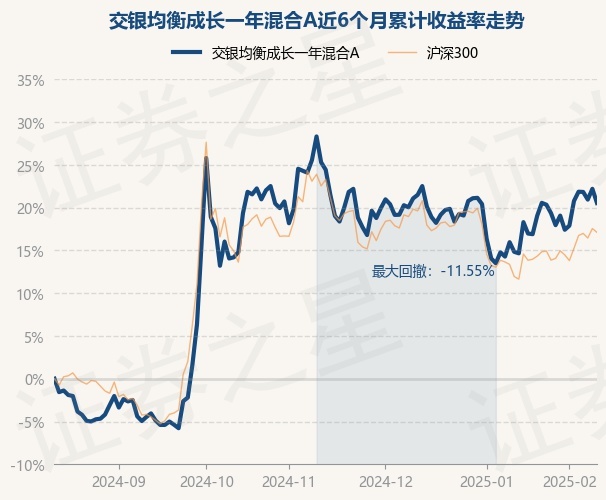 证券之星消息,2月13日,交银均衡成长一年混合A最新单位净值为0.8233元,累计净值为0.8863元,较前一交易日下跌1.35%。历史数据显示该基金近1个月上涨5.13%,近3个月下跌3.12%,近6个月上涨20.54%,近1年上涨16.42%。该基金近6个月的累计收益率走势如下图: