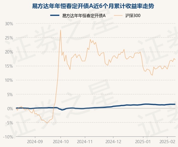 证券之星消息,2月13日,易方达年年恒春定开债A最新单位净值为1.0186元,累计净值为1.1523元,较前一交易日上涨0.0%。历史数据显示该基金近1个月上涨0.04%,近3个月上涨1.2%,近6个月上涨1.38%,近1年上涨3.68%。该基金近6个月的累计收益率走势如下图: