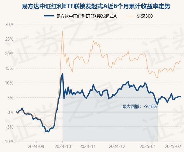 证券之星消息,2月13日,易方达中证红利ETF联接发起式A最新单位净值为1.2001元,累计净值为1.4001元,较前一交易日上涨0.0%。历史数据显示该基金近1个月上涨2.6%,近3个月下跌1.64%,近6个月上涨5.38%,近1年上涨6.69%。该基金近6个月的累计收益率走势如下图: