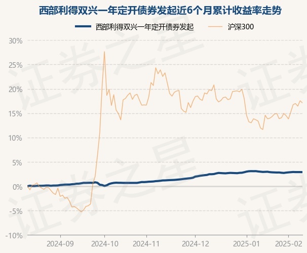证券之星消息,2月13日,西部利得双兴一年定开债券发起最新单位净值为1.0564元,累计净值为1.0944元,较前一交易日下跌0.01%。历史数据显示该基金近1个月下跌0.04%,近3个月上涨1.67%,近6个月上涨2.89%,近1年上涨5.49%。该基金近6个月的累计收益率走势如下图:
