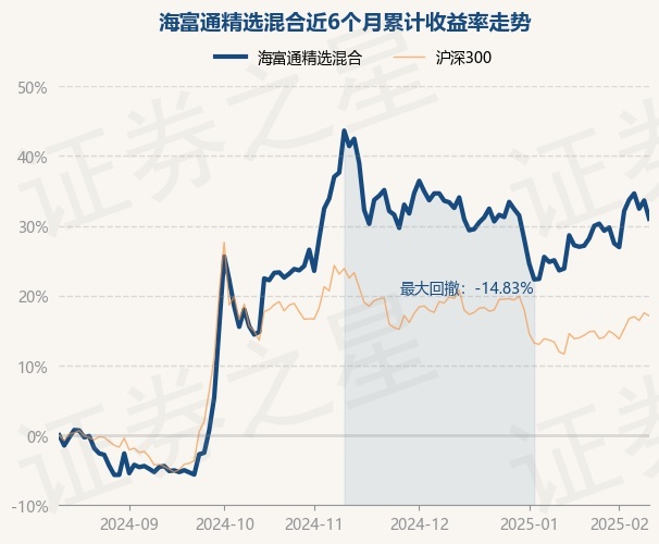 证券之星消息,2月13日,海富通精选混合最新单位净值为0.5351元,累计净值为4.7805元,较前一交易日下跌1.96%。历史数据显示该基金近1个月上涨5.75%,近3个月下跌8.02%,近6个月上涨31.05%,近1年上涨37.49%。该基金近6个月的累计收益率走势如下图: