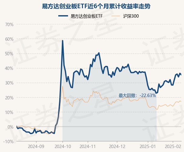证券之星消息,2月13日,易方达创业板ETF最新单位净值为2.1351元,累计净值为2.4459元,较前一交易日下跌0.72%。历史数据显示该基金近1个月上涨9.85%,近3个月下跌9.95%,近6个月上涨35.38%,近1年上涨27.01%。该基金近6个月的累计收益率走势如下图: