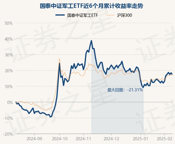 证券之星消息,2月13日,国泰中证军工ETF最新单位净值为1.0266元,累计净值为1.0266元,较前一交易日下跌0.88%。历史数据显示该基金近1个月上涨6.32%,近3个月下跌12.23%,近6个月上涨17.37%,近1年上涨23.69%。该基金近6个月的累计收益率走势如下图: