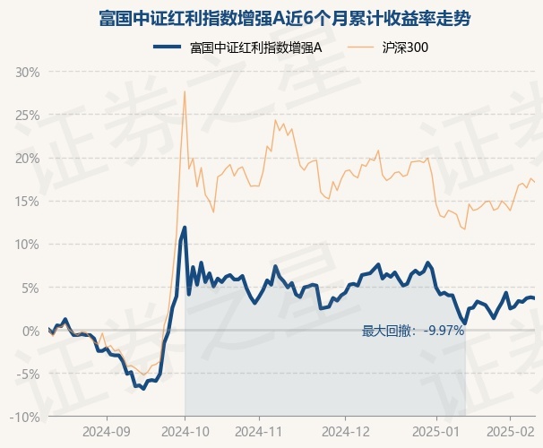 证券之星消息,2月13日,富国中证红利指数增强A最新单位净值为0.947元,累计净值为3.179元,较前一交易日下跌0.11%。历史数据显示该基金近1个月上涨2.91%,近3个月下跌1.69%,近6个月上涨3.65%,近1年上涨4.18%。该基金近6个月的累计收益率走势如下图: