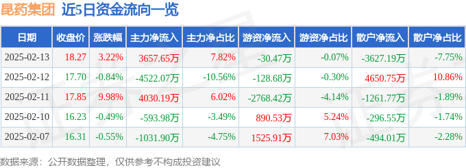 证券之星消息,截至2025年2月13日收盘,昆药集团(600422)报收于18.27元,上涨3.22%,换手率3.4%,成交量25.71万手,成交额4.68亿元。