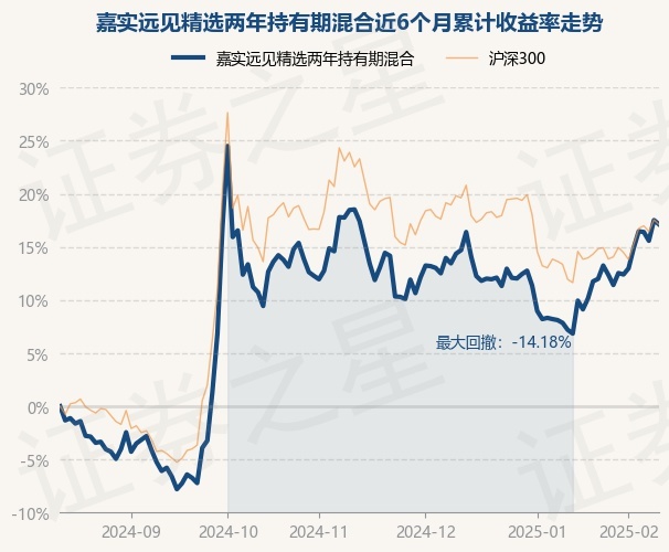证券之星消息,2月13日,嘉实远见精选两年持有期混合最新单位净值为0.6278元,累计净值为0.6278元,较前一交易日下跌0.33%。历史数据显示该基金近1个月上涨9.62%,近3个月下跌0.25%,近6个月上涨17.13%,近1年上涨9.49%。该基金近6个月的累计收益率走势如下图: