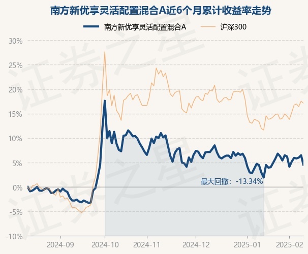 证券之星消息,2月13日,南方新优享灵活配置混合A最新单位净值为3.0488元,累计净值为3.0488元,较前一交易日下跌1.82%。历史数据显示该基金近1个月上涨2.57%,近3个月下跌5.41%,近6个月上涨4.55%,近1年上涨5.2%。该基金近6个月的累计收益率走势如下图: