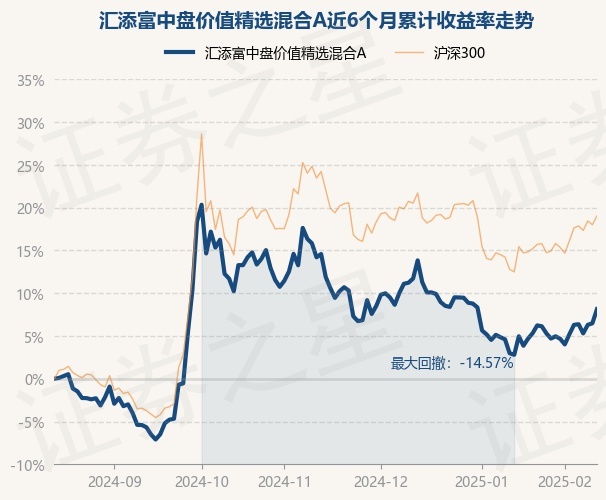 证券之星消息,2月14日,汇添富中盘价值精选混合A最新单位净值为0.6956元,累计净值为0.6956元,较前一交易日上涨1.55%。历史数据显示该基金近1个月上涨3.02%,近3个月下跌3.36%,近6个月上涨8.13%,近1年上涨5.2%。该基金近6个月的累计收益率走势如下图:
