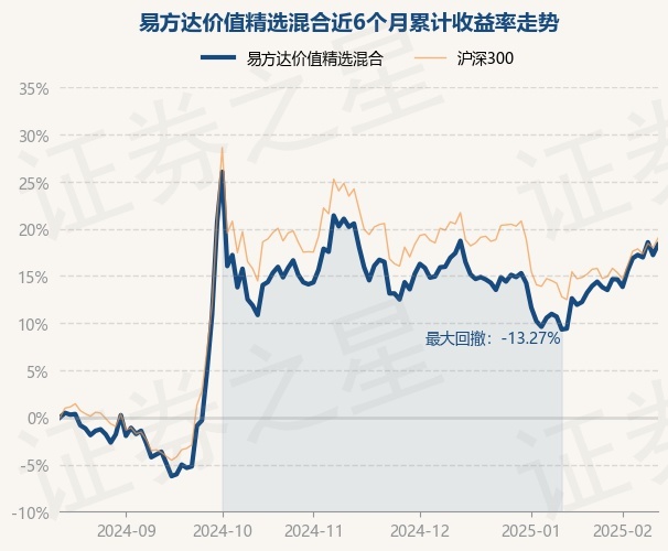 证券之星消息,2月14日,易方达价值精选混合最新单位净值为1.1元,累计净值为3.875元,较前一交易日上涨0.94%。历史数据显示该基金近1个月上涨5.09%,近3个月上涨0.23%,近6个月上涨18.35%,近1年上涨10.11%。该基金近6个月的累计收益率走势如下图: