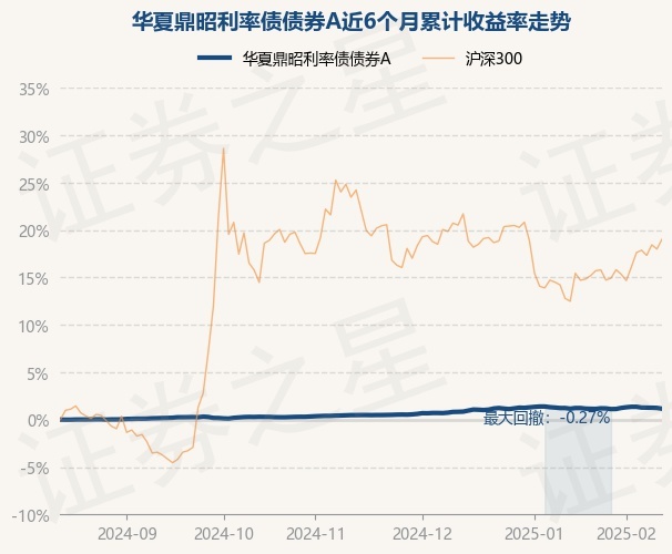 证券之星消息,2月14日,华夏鼎昭利率债债券A最新单位净值为1.0093元,累计净值为1.0243元,较前一交易日下跌0.08%。历史数据显示该基金近1个月下跌0.07%,近3个月上涨0.67%,近6个月上涨1.15%,近1年上涨2.44%。该基金近6个月的累计收益率走势如下图: