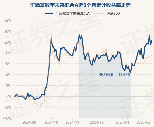 证券之星消息,2月14日,汇添富数字未来混合A最新单位净值为0.6553元,累计净值为0.6553元,较前一交易日上涨1.46%。历史数据显示该基金近1个月上涨8.98%,近3个月上涨1.2%,近6个月上涨25.46%,近1年上涨26.92%。该基金近6个月的累计收益率走势如下图:
