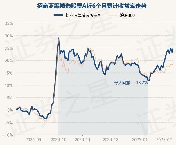 证券之星消息,2月14日,招商蓝筹精选股票A最新单位净值为0.6904元,累计净值为0.6904元,较前一交易日上涨1.78%。历史数据显示该基金近1个月上涨9.1%,近3个月上涨5.6%,近6个月上涨25.34%,近1年上涨30.44%。该基金近6个月的累计收益率走势如下图: