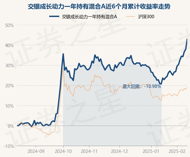 证券之星消息,2月14日,交银成长动力一年持有混合A最新单位净值为0.7638元,累计净值为0.7638元,较前一交易日上涨3.57%。历史数据显示该基金近1个月上涨15.55%,近3个月上涨9.49%,近6个月上涨42.85%,近1年上涨45.96%。该基金近6个月的累计收益率走势如下图: