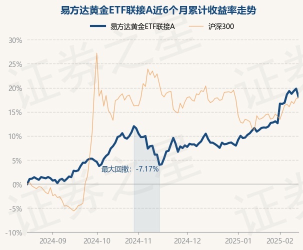证券之星消息,2月17日,易方达黄金ETF联接A最新单位净值为2.2504元,累计净值为2.2504元,较前一交易日下跌1.45%。历史数据显示该基金近1个月上涨5.67%,近3个月上涨13.43%,近6个月上涨18.09%,近1年上涨37.72%。该基金近6个月的累计收益率走势如下图:
