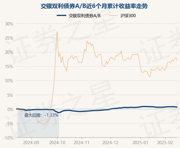 证券之星消息,2月17日,交银双利债券A/B最新单位净值为1.3957元,累计净值为1.7337元,较前一交易日下跌0.04%。历史数据显示该基金近1个月上涨0.06%,近3个月上涨1.25%,近6个月上涨0.69%,近1年上涨3.29%。该基金近6个月的累计收益率走势如下图: