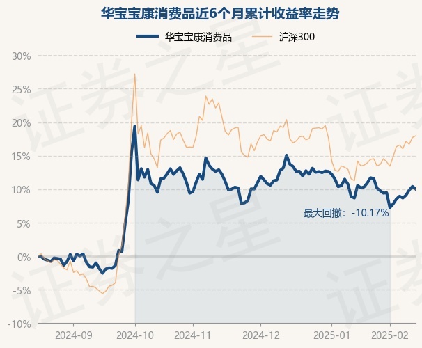证券之星消息,2月17日,华宝宝康消费品最新单位净值为2.9994元,累计净值为8.8258元,较前一交易日下跌0.36%。历史数据显示该基金近1个月下跌0.83%,近3个月下跌1.03%,近6个月上涨10.01%,近1年下跌0.57%。该基金近6个月的累计收益率走势如下图: