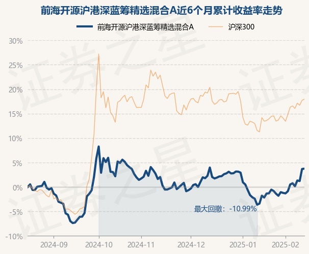 证券之星消息,2月17日,前海开源沪港深蓝筹精选混合A最新单位净值为1.0981元,累计净值为1.2591元,较前一交易日上涨0.06%。历史数据显示该基金近1个月上涨5.11%,近3个月上涨4.29%,近6个月上涨3.74%,近1年上涨10.65%。该基金近6个月的累计收益率走势如下图: