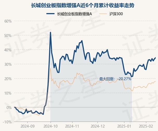 证券之星消息,2月17日,长城创业板指数增强A最新单位净值为1.6298元,累计净值为1.6298元,较前一交易日上涨0.62%。历史数据显示该基金近1个月上涨6.06%,近3个月下跌1.8%,近6个月上涨34.38%,近1年上涨23.99%。该基金近6个月的累计收益率走势如下图: