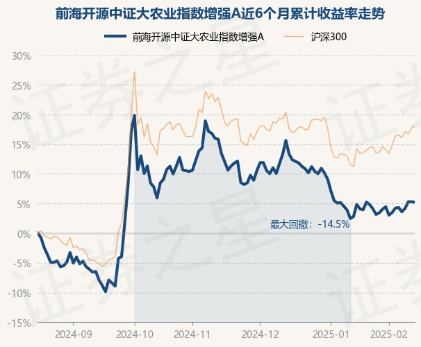 证券之星消息,2月17日,前海开源中证大农业指数增强A最新单位净值为0.8994元,累计净值为0.8994元,较前一交易日下跌0.07%。历史数据显示该基金近1个月下跌0.01%,近3个月下跌6.1%,近6个月上涨5.22%,近1年下跌4.15%。该基金近6个月的累计收益率走势如下图: