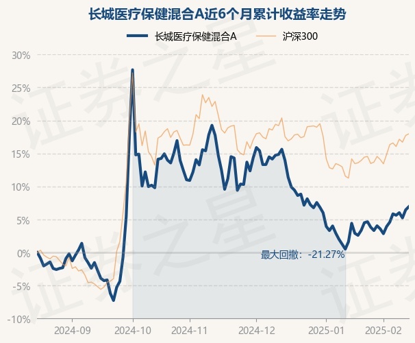 证券之星消息,2月17日,长城医疗保健混合A最新单位净值为2.2874元,累计净值为2.2874元,较前一交易日上涨0.45%。历史数据显示该基金近1个月上涨3.47%,近3个月下跌4.93%,近6个月上涨6.93%,近1年下跌4.67%。该基金近6个月的累计收益率走势如下图: