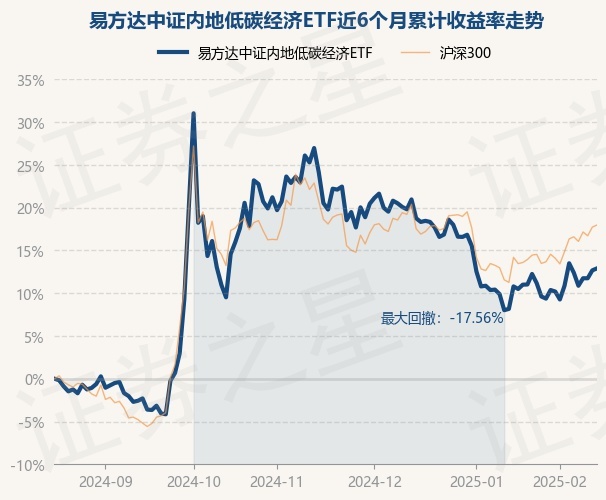 证券之星消息,2月17日,易方达中证内地低碳经济ETF最新单位净值为0.4509元,累计净值为0.9018元,较前一交易日上涨0.2%。历史数据显示该基金近1个月上涨1.69%,近3个月下跌6.34%,近6个月上涨12.89%,近1年上涨12.7%。该基金近6个月的累计收益率走势如下图: