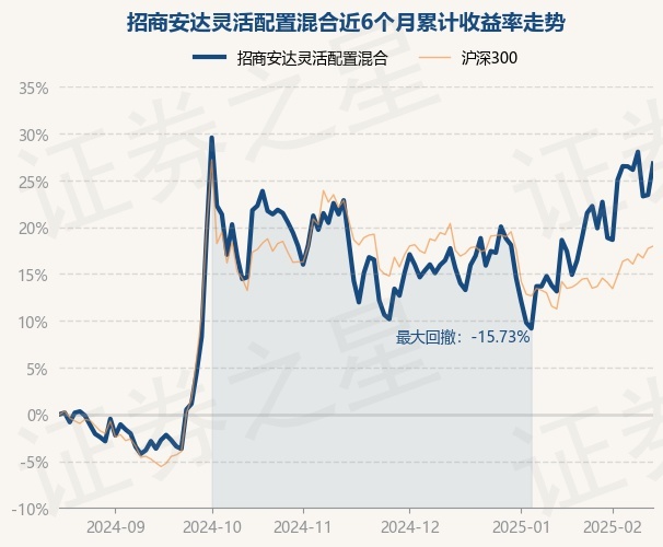 证券之星消息,2月17日,招商安达灵活配置混合最新单位净值为1.8082元,累计净值为2.1061元,较前一交易日上涨2.71%。历史数据显示该基金近1个月上涨8.91%,近3个月上涨10.97%,近6个月上涨26.79%,近1年上涨27.6%。该基金近6个月的累计收益率走势如下图: