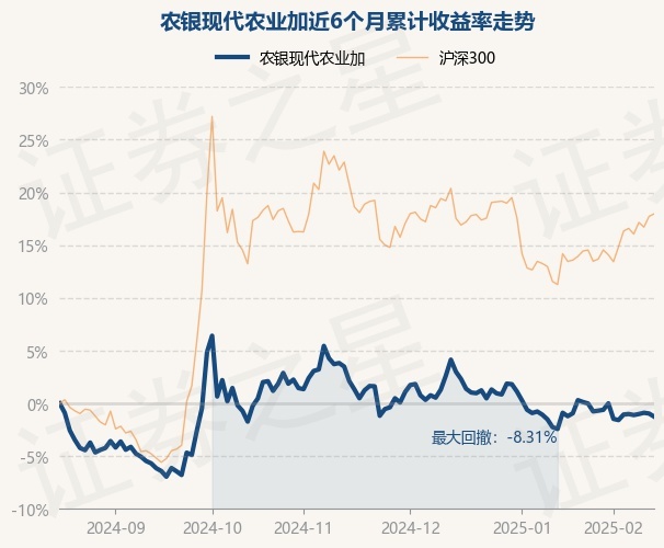 证券之星消息,2月17日,农银现代农业加最新单位净值为1.2401元,累计净值为1.2401元,较前一交易日下跌0.3%。历史数据显示该基金近1个月下跌1.56%,近3个月下跌2.55%,近6个月下跌1.26%,近1年下跌12.94%。该基金近6个月的累计收益率走势如下图: