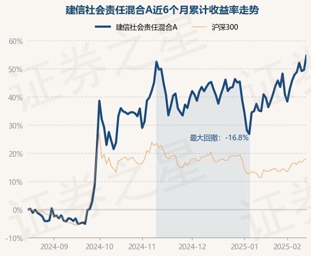 证券之星消息,2月17日,建信社会责任混合A最新单位净值为2.245元,累计净值为2.755元,较前一交易日上涨3.36%。历史数据显示该基金近1个月上涨11.64%,近3个月上涨9.83%,近6个月上涨54.61%,近1年上涨61.51%。该基金近6个月的累计收益率走势如下图: