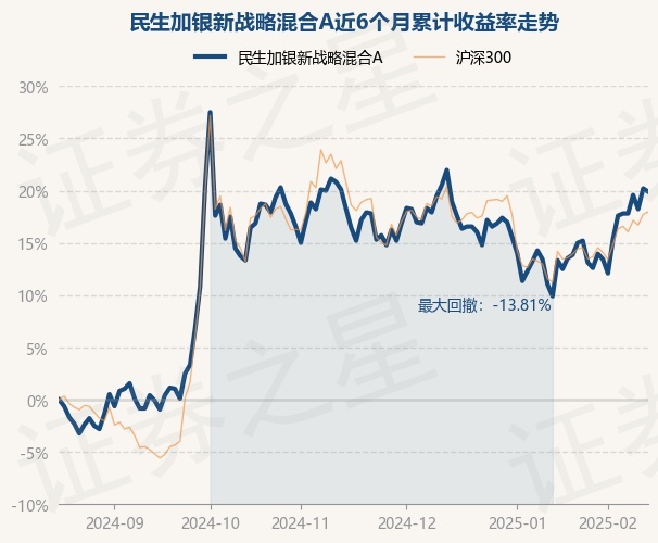 证券之星消息,2月17日,民生加银新战略混合A最新单位净值为1.151元,累计净值为1.278元,较前一交易日下跌0.26%。历史数据显示该基金近1个月上涨5.31%,近3个月上涨2.95%,近6个月上涨19.9%。该基金近6个月的累计收益率走势如下图: