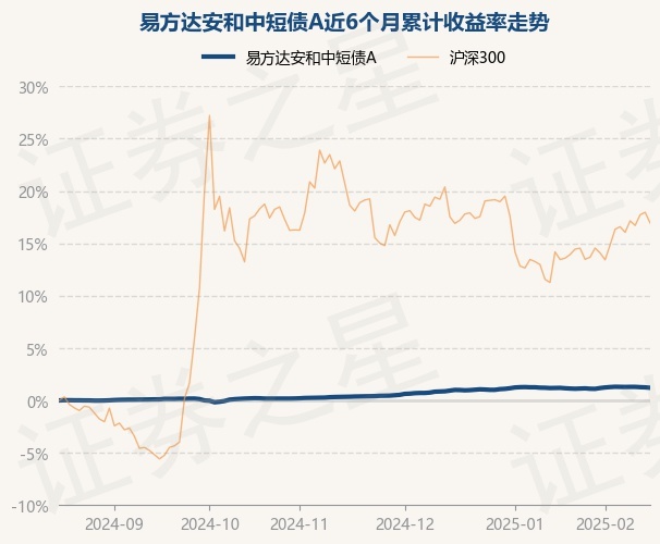 证券之星消息,2月17日,易方达安和中短债A最新单位净值为1.0691元,累计净值为1.1291元,较前一交易日下跌0.02%。历史数据显示该基金近1个月上涨0.11%,近3个月上涨0.89%,近6个月上涨1.25%,近1年上涨2.78%。该基金近6个月的累计收益率走势如下图: