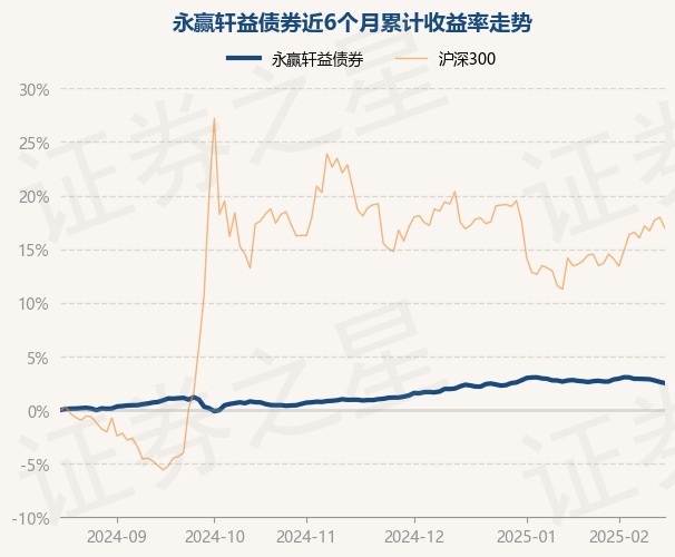 证券之星消息,2月17日,永赢轩益债券最新单位净值为1.0569元,累计净值为1.1299元,较前一交易日下跌0.13%。历史数据显示该基金近1个月下跌0.06%,近3个月上涨1.64%,近6个月上涨2.62%,近1年上涨5.74%。该基金近6个月的累计收益率走势如下图:
