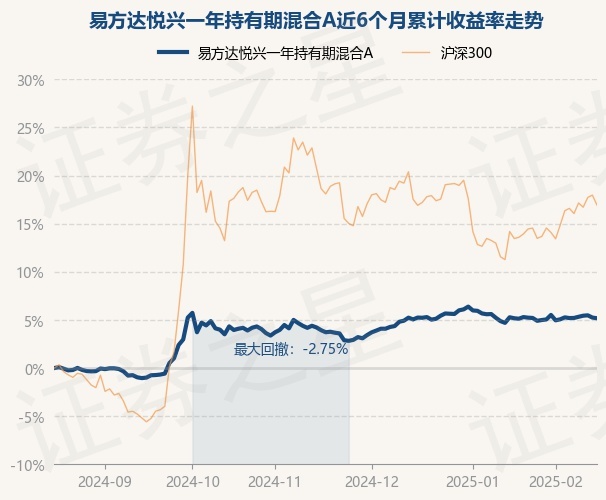 证券之星消息,2月18日,易方达悦兴一年持有期混合A最新单位净值为1.0352元,累计净值为1.0352元,较前一交易日下跌0.07%。历史数据显示该基金近1个月下跌0.12%,近3个月上涨1.4%,近6个月上涨5.17%,近1年上涨7.44%。该基金近6个月的累计收益率走势如下图:
