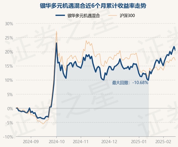 证券之星消息,2月18日,银华多元机遇混合最新单位净值为0.5173元,累计净值为0.5173元,较前一交易日下跌1.07%。历史数据显示该基金近1个月上涨5.53%,近3个月上涨6.81%,近6个月上涨20.47%,近1年上涨16.33%。该基金近6个月的累计收益率走势如下图: