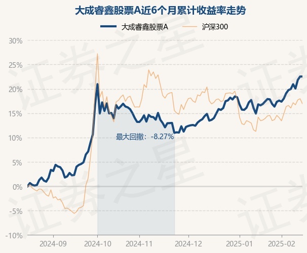 证券之星消息,2月18日,大成睿鑫股票A最新单位净值为1.3034元,累计净值为1.3034元,较前一交易日上涨0.0%。历史数据显示该基金近1个月上涨4.41%,近3个月上涨9.36%,近6个月上涨22.59%,近1年上涨26.05%。该基金近6个月的累计收益率走势如下图: