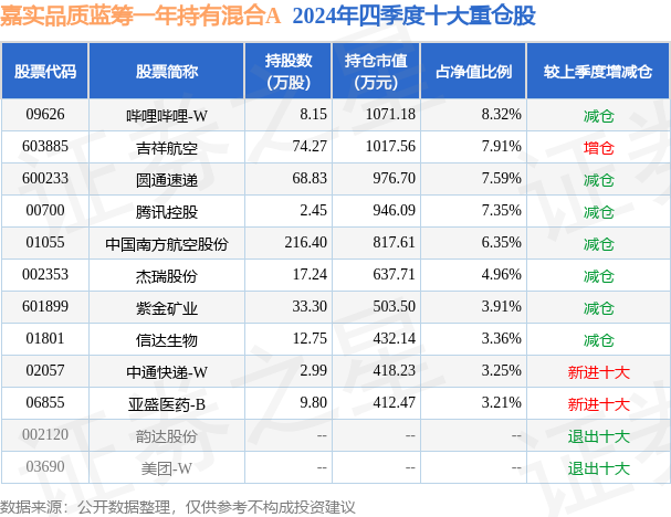 嘉实品质蓝筹一年持有混合A为混合型-偏股基金,根据最新一期基金季报显示,该基金资产配置:股票占净值比93.56%,债券占净值比0.08%,现金占净值比5.82%。基金十大重仓股如下: