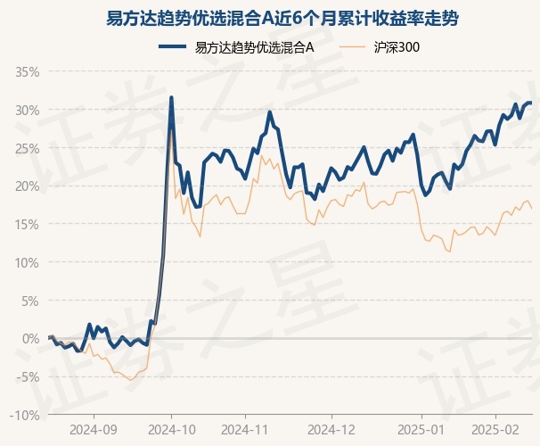 证券之星消息,2月18日,易方达趋势优选混合A最新单位净值为0.7817元,累计净值为0.7817元,较前一交易日上涨0.0%。历史数据显示该基金近1个月上涨4.83%,近3个月上涨9.02%,近6个月上涨30.5%,近1年上涨19.67%。该基金近6个月的累计收益率走势如下图: