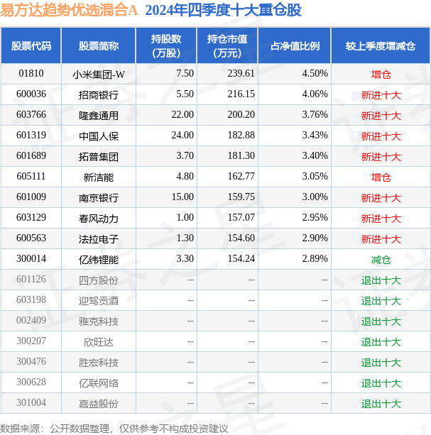 易方达趋势优选混合A为混合型-偏股基金,根据最新一期基金季报显示,该基金资产配置:股票占净值比94.18%,债券占净值比0.08%,现金占净值比5.98%。基金十大重仓股如下: