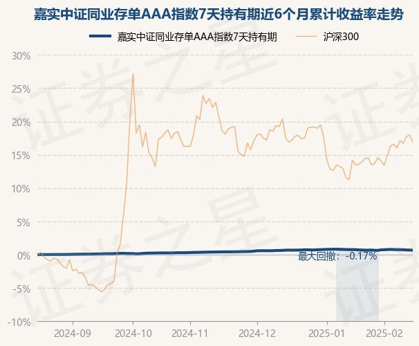 证券之星消息,2月18日,嘉实中证同业存单AAA指数7天持有期最新单位净值为1.0583元,累计净值为1.0583元,较前一交易日下跌0.02%。历史数据显示该基金近1个月下跌0.03%,近3个月上涨0.25%,近6个月上涨0.68%,近1年上涨1.78%。该基金近6个月的累计收益率走势如下图: