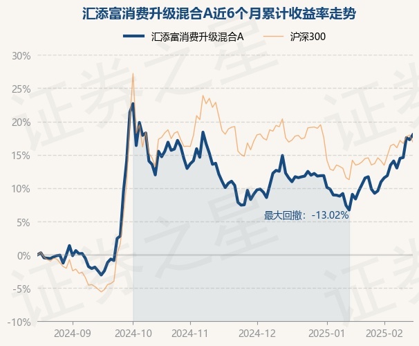 证券之星消息,2月18日,汇添富消费升级混合A最新单位净值为1.6915元,累计净值为1.6915元,较前一交易日上涨0.62%。历史数据显示该基金近1个月上涨6.76%,近3个月上涨7.2%,近6个月上涨18.0%,近1年上涨15.2%。该基金近6个月的累计收益率走势如下图: