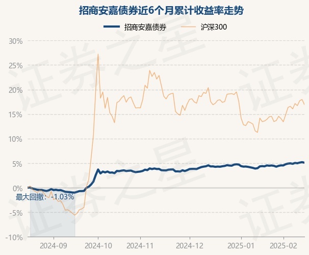 证券之星消息,2月18日,招商安嘉债券最新单位净值为1.0383元,累计净值为1.1819元,较前一交易日下跌0.11%。历史数据显示该基金近1个月上涨0.53%,近3个月上涨1.51%,近6个月上涨5.08%,近1年上涨9.74%。该基金近6个月的累计收益率走势如下图:
