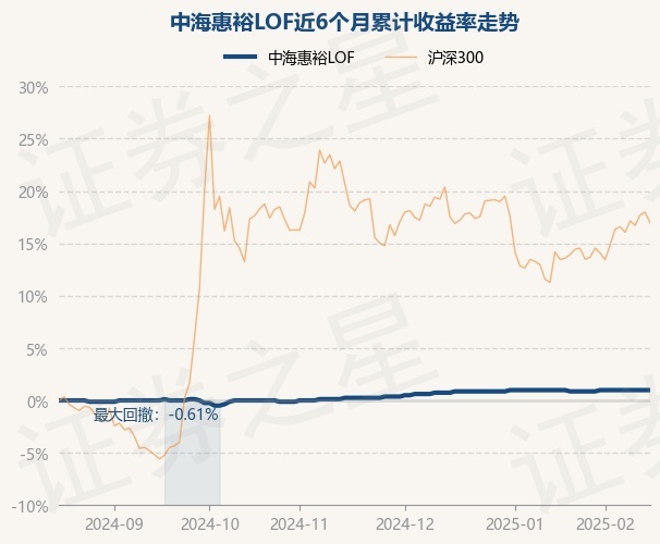 证券之星消息,2月18日,中海惠裕LOF最新单位净值为0.821元,累计净值为1.525元,较前一交易日上涨0.0%。历史数据显示该基金近1个月上涨0.12%,近3个月上涨0.74%,近6个月上涨0.98%,近1年上涨3.01%。该基金近6个月的累计收益率走势如下图: