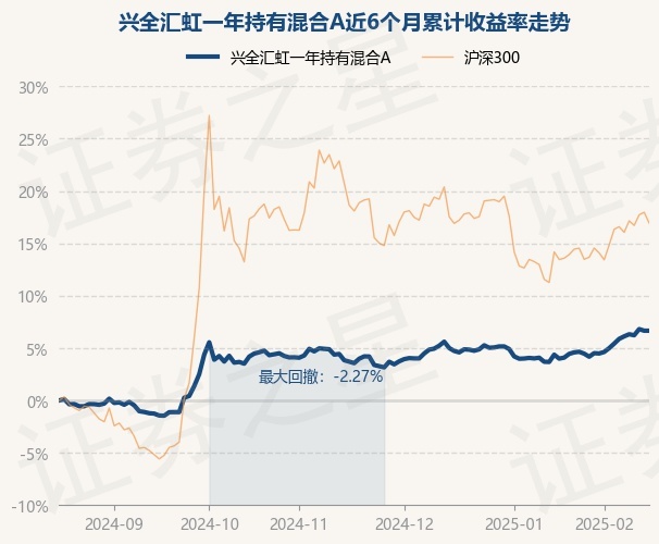 证券之星消息,2月18日,兴全汇虹一年持有混合A最新单位净值为1.1086元,累计净值为1.1086元,较前一交易日上涨0.0%。历史数据显示该基金近1个月上涨2.09%,近3个月上涨2.96%,近6个月上涨6.63%,近1年上涨12.39%。该基金近6个月的累计收益率走势如下图:
