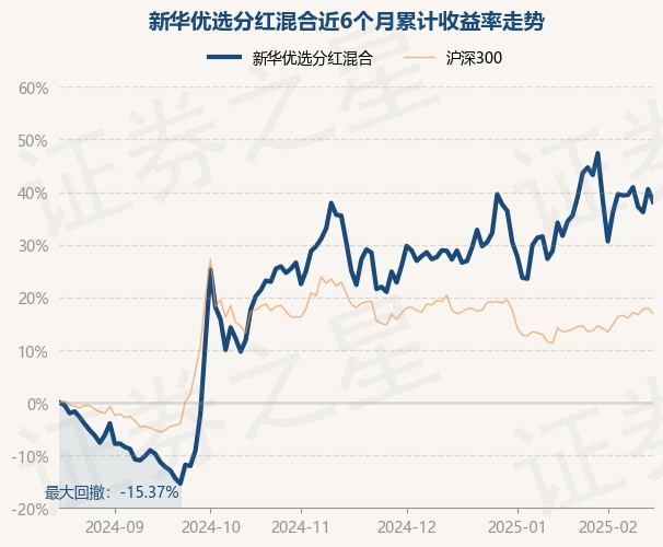 证券之星消息,2月18日,新华优选分红混合最新单位净值为0.6433元,累计净值为4.1664元,较前一交易日下跌1.71%。历史数据显示该基金近1个月上涨1.9%,近3个月上涨12.88%,近6个月上涨38.14%,近1年上涨31.53%。该基金近6个月的累计收益率走势如下图: