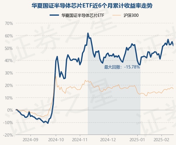 证券之星消息,2月18日,华夏国证半导体芯片ETF最新单位净值为1.271元,累计净值为1.271元,较前一交易日下跌2.0%。历史数据显示该基金近1个月上涨4.38%,近3个月上涨6.52%,近6个月上涨51.85%,近1年上涨60.99%。该基金近6个月的累计收益率走势如下图: