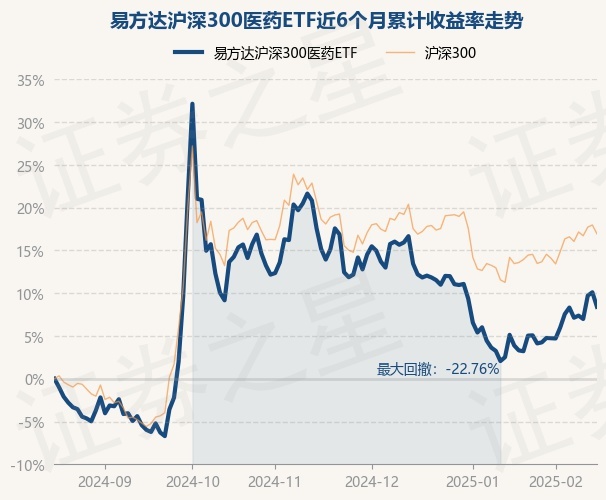 证券之星消息,2月18日,易方达沪深300医药ETF最新单位净值为0.3572元,累计净值为1.4288元,较前一交易日下跌1.54%。历史数据显示该基金近1个月上涨5.03%,近3个月下跌4.85%,近6个月上涨8.41%,近1年下跌3.22%。该基金近6个月的累计收益率走势如下图: