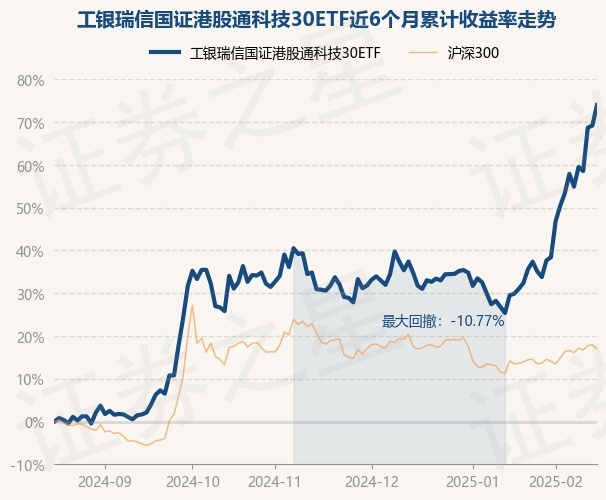 证券之星消息,2月18日,工银瑞信国证港股通科技30ETF最新单位净值为1.3171元,累计净值为1.3171元,较前一交易日上涨2.83%。历史数据显示该基金近1个月上涨31.41%,近3个月上涨33.22%,近6个月上涨73.97%,近1年上涨111.41%。该基金近6个月的累计收益率走势如下图: