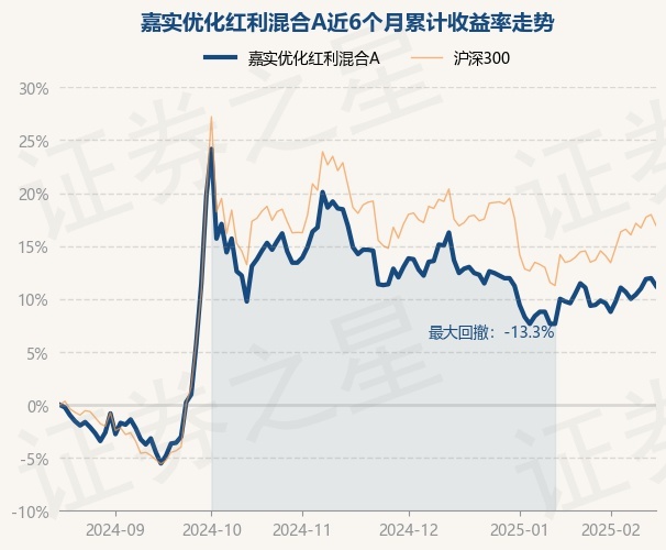 证券之星消息,2月18日,嘉实优化红利混合A最新单位净值为1.367元,累计净值为3.253元,较前一交易日下跌0.65%。历史数据显示该基金近1个月上涨0.66%,近3个月下跌2.64%,近6个月上涨11.23%,近1年上涨3.8%。该基金近6个月的累计收益率走势如下图: