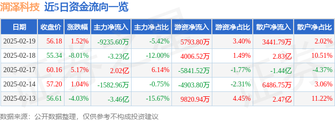 证券之星消息,截至2025年2月19日收盘,润泽科技(300442)报收于56.18元,上涨1.52%,换手率5.51%,成交量30.51万手,成交额17.05亿元。