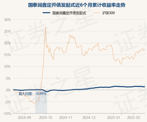 证券之星消息,2月19日,国泰润鑫定开债发起式最新单位净值为1.0434元,累计净值为1.3323元,较前一交易日上涨0.02%。历史数据显示该基金近1个月上涨0.05%,近3个月上涨1.13%,近6个月上涨1.29%,近1年上涨3.96%。该基金近6个月的累计收益率走势如下图: